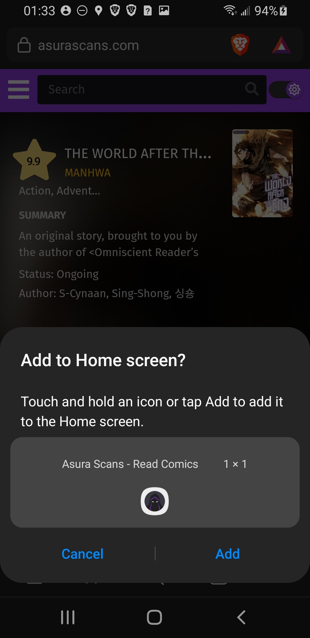 In the screenshots I had provided, on the last one you’ll see where it shows the name of the website Asure Scans - Read Comics followed by a 1x1. Under that is the icon which would appear on my Android’s home page. If I press and hold down on that, it will then switch to my home screen and the icon will be at my finger, allowing me to place it any specific place I want. Whereas if you didn’t touch and hold the icon and instead pressed Add, it would randomly try to place it somewhere.