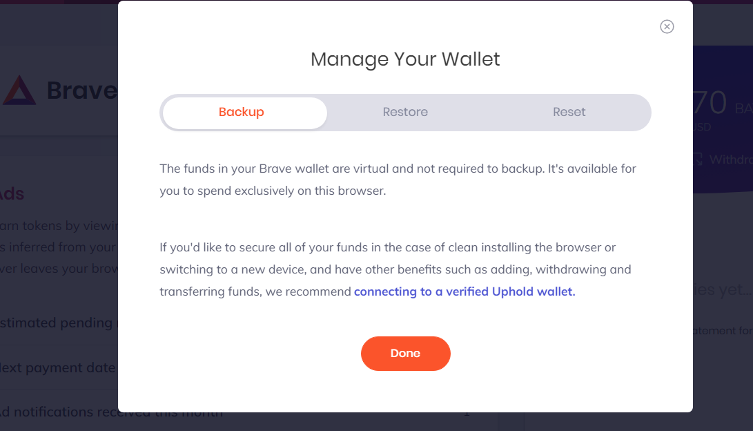 Also according to the message in the Backup in windows “The funds in your Brave wallet are virtual and not required to backup. It’s available for you to spend exclusively on this browser”