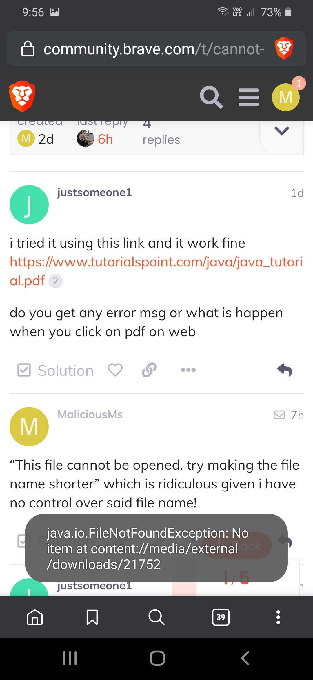 Do you have Brave set to download files to internal storage or to an SD card you have?