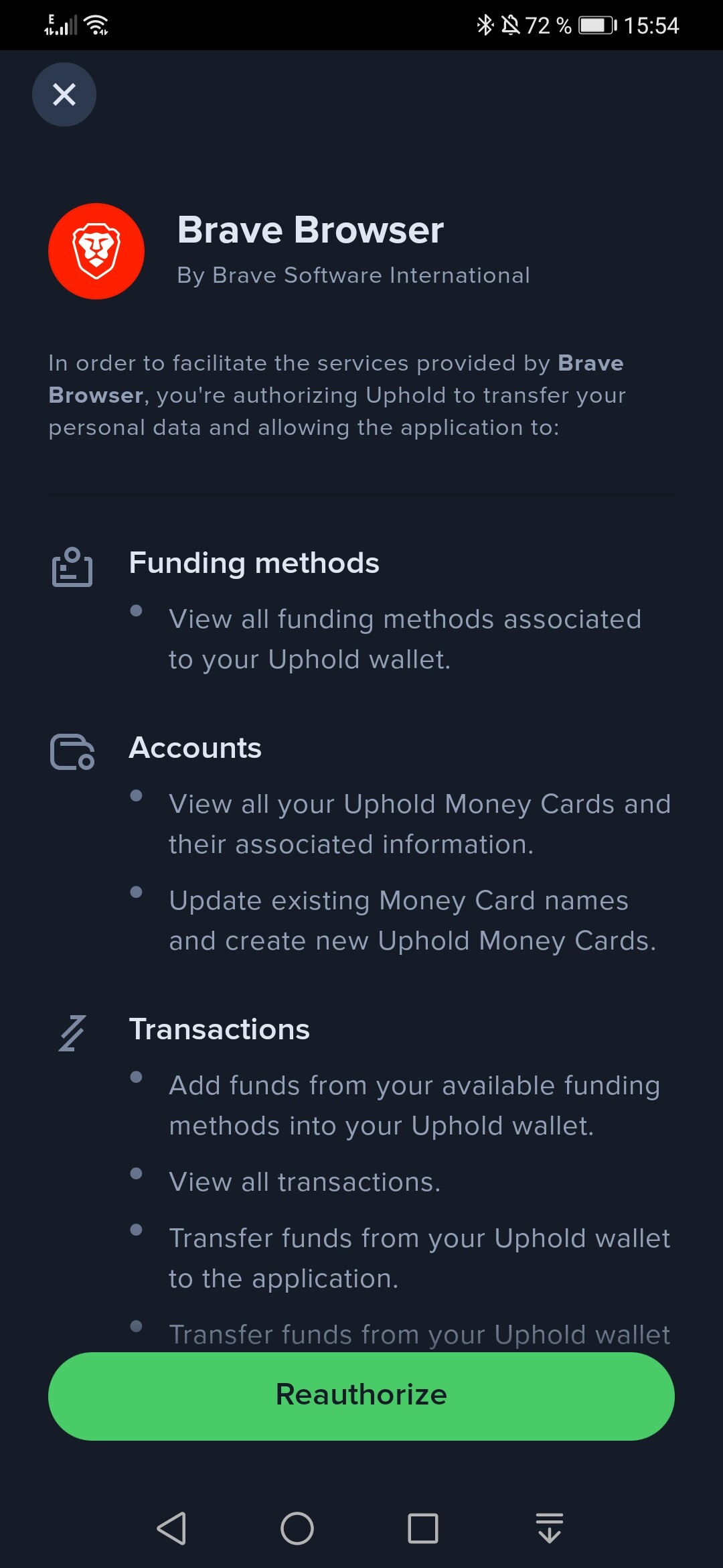 When I try to enter through Brave to Uphold, I have to verivy/reauthorize my Uphold account and then I see, that the connection didn’t work and have to retry.