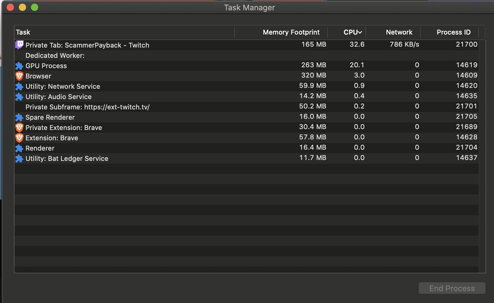 I have a couple extensions, but they are disabled. So far, it seem to be mostly Twitch, I don’t see such a large CPU usage on Youtube. Here is another screenshot with extensions disabled.