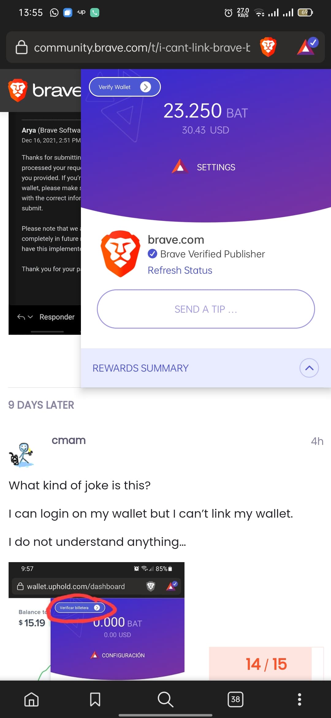 Hi, yesterday I noticed that my Brave browser has been unlinked from my Uphold account. I tried to link it again, but it won’t let me do it. A few weeks ago I had the problem that my wallet was flagged and therefore I had not received ads or rewards. That is solved, but now I have this problem.