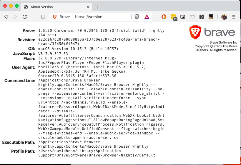 Chrome, click Import, and see what happens. If it doesn’t work, there’s a fairly easy workaround, but we’ll need to know what operating system you’re using and what version of it. While you’re at it, your version of Brave would be good, and you can get all of that by opening a new tab, typing brave://version in the address bar, and hitting return. It should look something like this, though if you’re running the latest main release, your version will be something like 1.2.43:Thank you! I have tried the first approach and it didn’t work. It says… Version 1.2.43 Chromium: 79.0.3945.130 (Official Build) (64-bit). I am also using Catalina OS