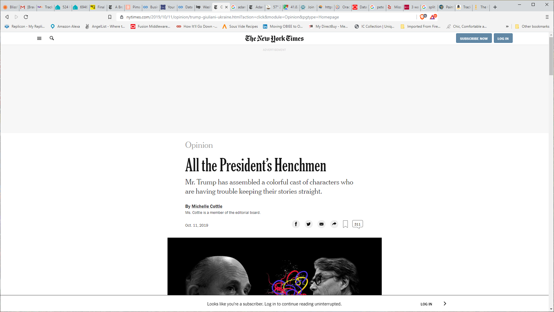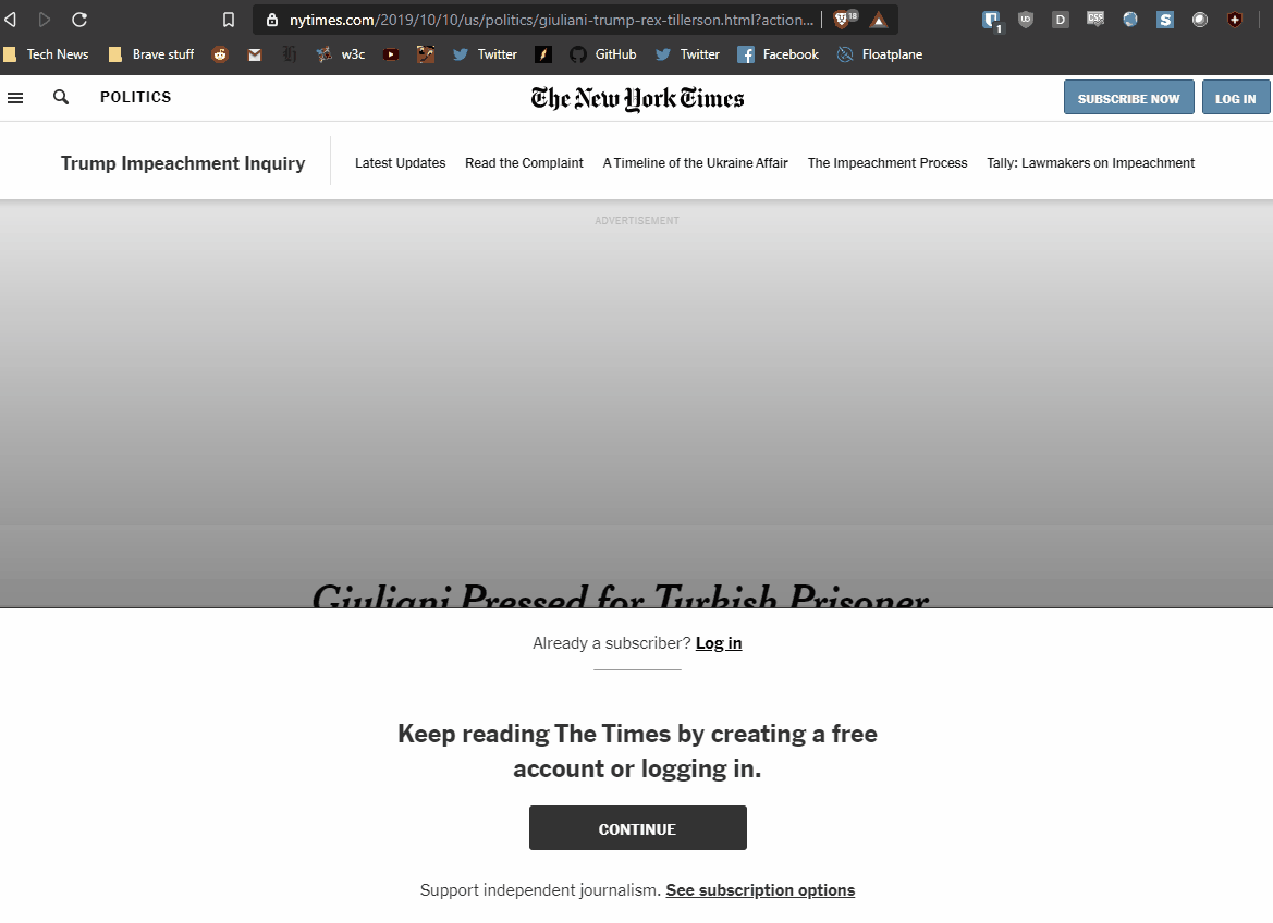The nut of it is you have turn off Brave shields to log into the New York Times online. This is an issue if you are paying to subscribe. It’s an issue if you want even click a “like” for an article or comment because you cannot without logging in. It’s also an issue because you have a limited number of unpaid articles. And of course there are all the adverts that suddenly pop-up and take over your screen.