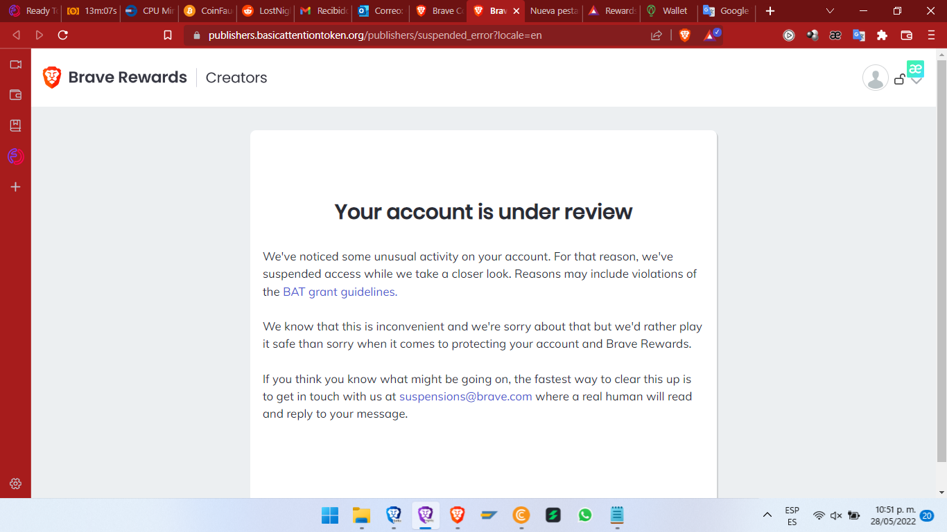 Ya lleva suspendida 1 mes, todo mayo se quedo suspendida, y envie mensaje al correo [suspensions@brave.com], haciendo la aclaracion pero, no me han contestado, ni resuleto nada.