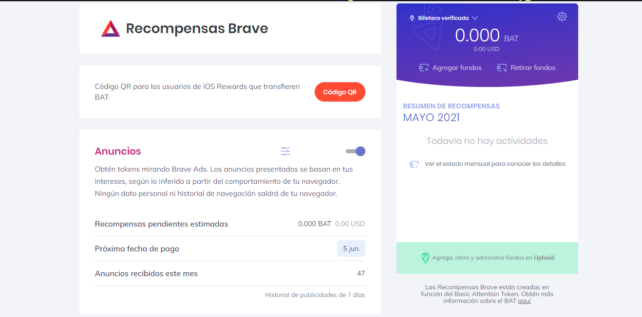 cuando entras a tu cuenta de uphold la tarjeta de brave rewards te muestra 0 bat?
