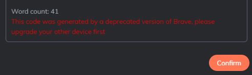 “This code was generated by a deprecated version of Brave, please upgrade your other device first”