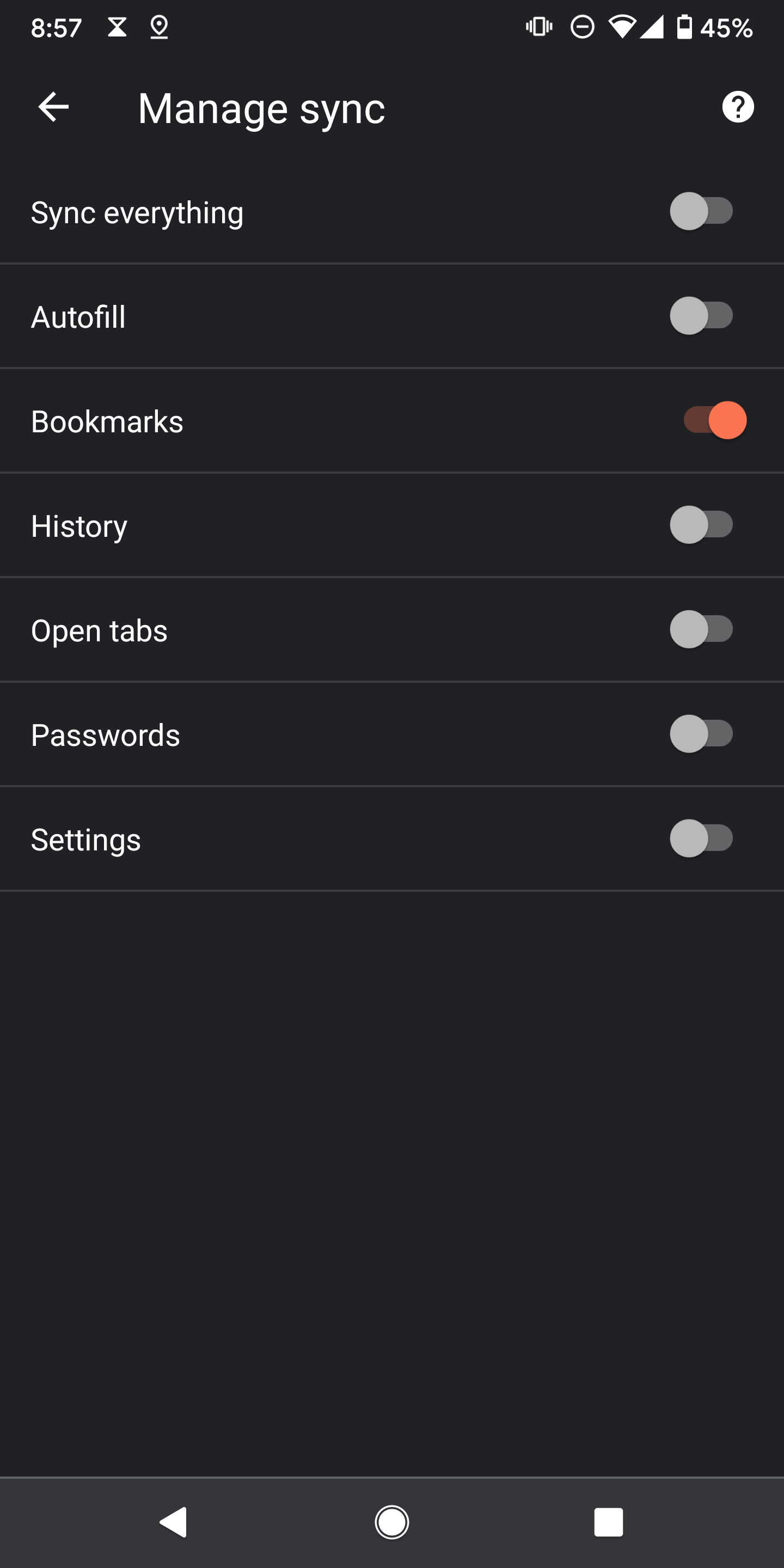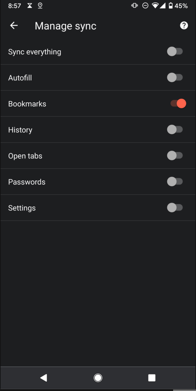 I had incorrectly believed setting sync data preferences (which consist of toggle switches for the various datasets that can be sync’d, such as bookmarks, history, and logins) on my desktop computer would control the data going to my Android.